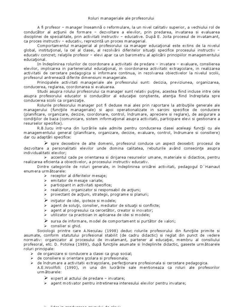 Rolurile profesorului manager pot fi deduse mai ales prin raportare la atribuţiile generale ale managerului (funcţiile manageriale) şi apoi operaționalizate în sarcini din alt punct de vedere, pot fi identificate zece roluri manageriale diferite ale profesorului, în care se încadrează activităţile acestuia. %stfel, cadrul cadrul didactic didactic devine manager pentru clasa pe care o conduce, conduce, şeful de catedră catedră devine virtutea unor ţinte strategice mai mari. In acest pdf poti vizualiza cuprinsul si bibliograa (daca sunt disponibile) si aproximativ doua pagini din documentul original.