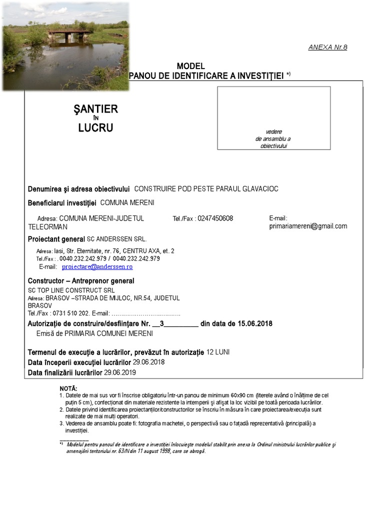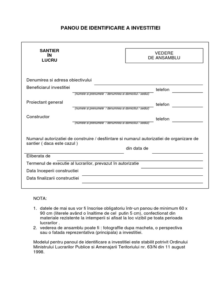 Suportul este rezistent la mediul exterior si printare cu rezistenta la raze uv, umezeala etc. _ *) modelul pentru panoul de identificare a investiţiei înlocuieşte modelul stabilit prin anexa la ordinul ministrului lucrărilor publice şi amenajării teritoriului nr. Download & view panou santier a4 as pdf for free.
